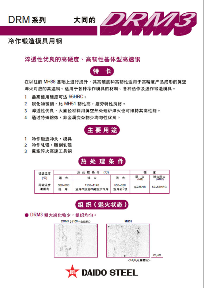 日本大同DRM3高速鋼:高硬度高韌性鋼,主要用于冷作鍛造。...