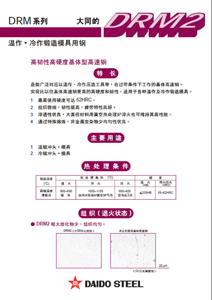 日本大同DRM2高速鋼:高硬度高韌性,主要用于溫作鍛造。...